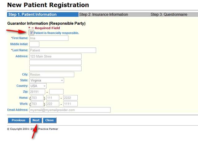 - Choose NEXT. Enter information for the financially responsible party. If the information is the same you can click the checkbox at the top; else enter in the appropriate information.