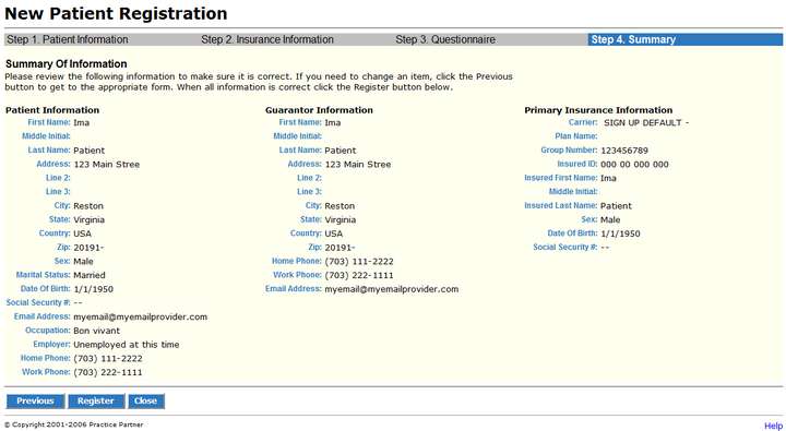 - Review. If correct, click REGISTER. You may click on PREVIOUS to go back to update previous parts. If this just isn’t working, click CLOSE to close without saving.