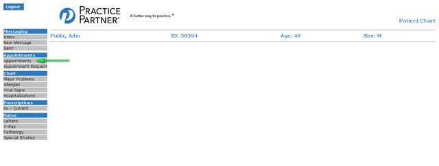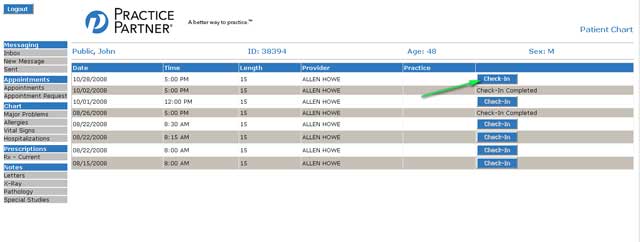 - You will see a list of appointments. The upcoming appointment has a button CHECK-IN (green arrow). Click on that button to check in. You may check in 48 hours prior to your appointment.