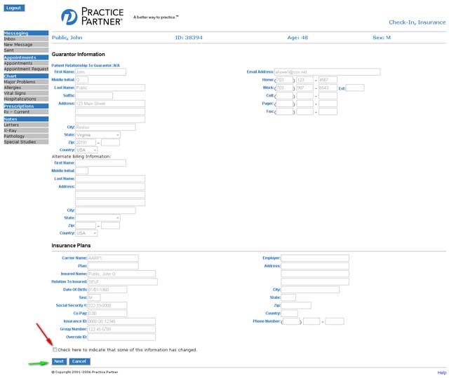 - The next screen shows billing and insurance information. You cannot edit these fields, but if they are incorrect click on the box (red arrow) that the information has changed. Then click NEXT. If you check the changed information box the office will get an email indicating that you need to