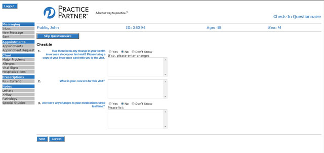 - The next screen shows a few questions for your check in. Please answer the questions and then click NEXT. (Please be patient, these screens are a little slow.)