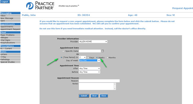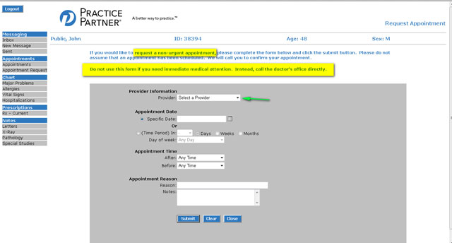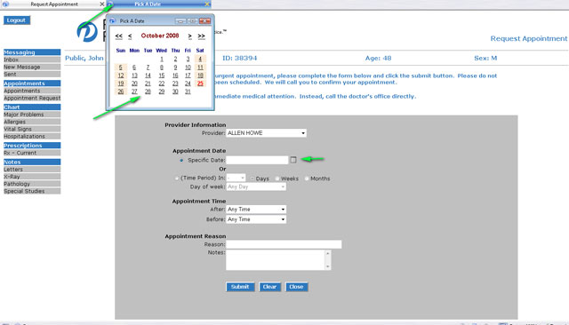 Click on the drop down box to select a provider (green arrow). Select a provider from the list. - You may click on the button to request a specific date. Click on the small calendar icon to select the date. The calendar opens in a new window