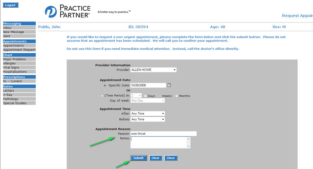 - Add a reason for the appointment and a note if desired. Then click SUBMIT.